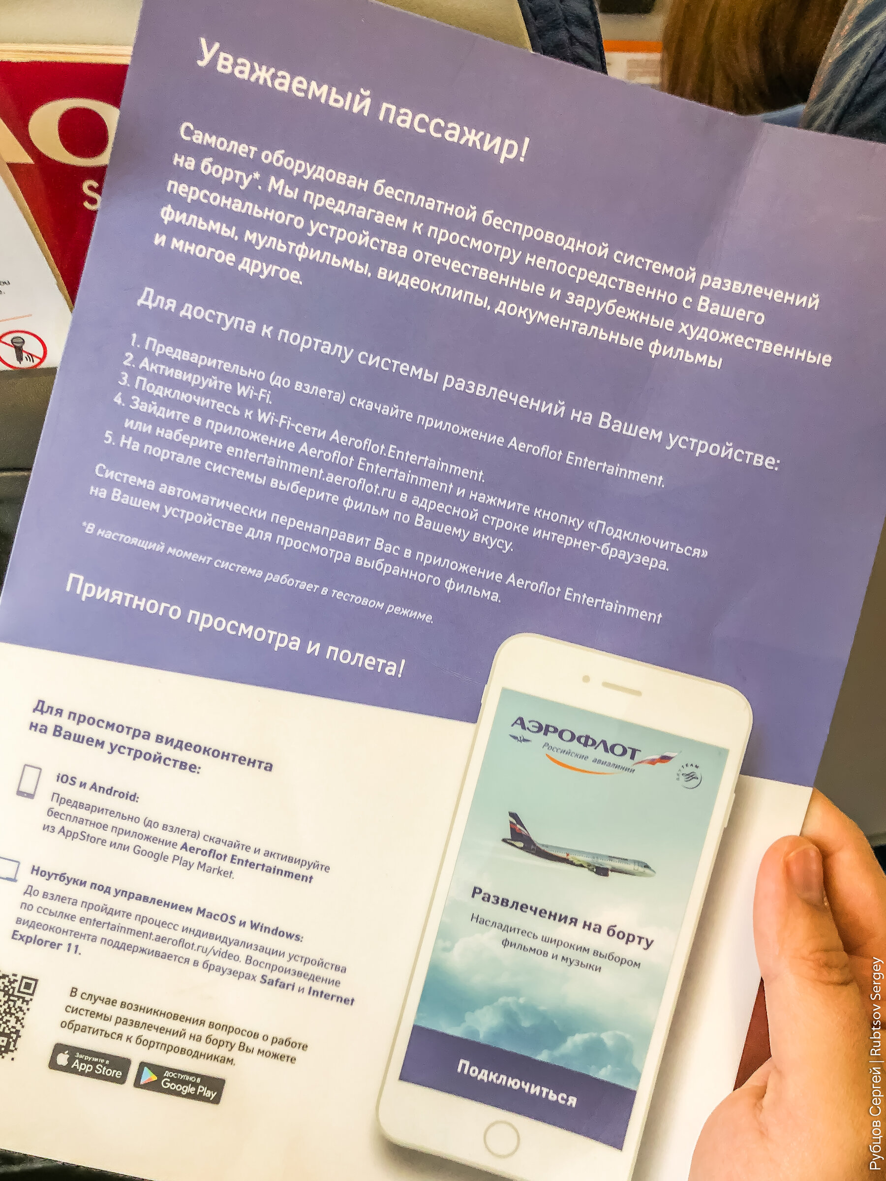 Еще обещали, что установив специальное приложение я смогу пользоваться беспроводной системой развлечения, но это почему-то не работало. Могли бы тогда убрать листовки, что зря рекламировать. В итоге традиционно пришлось коротать время за игрой в третьих героев на планшете.