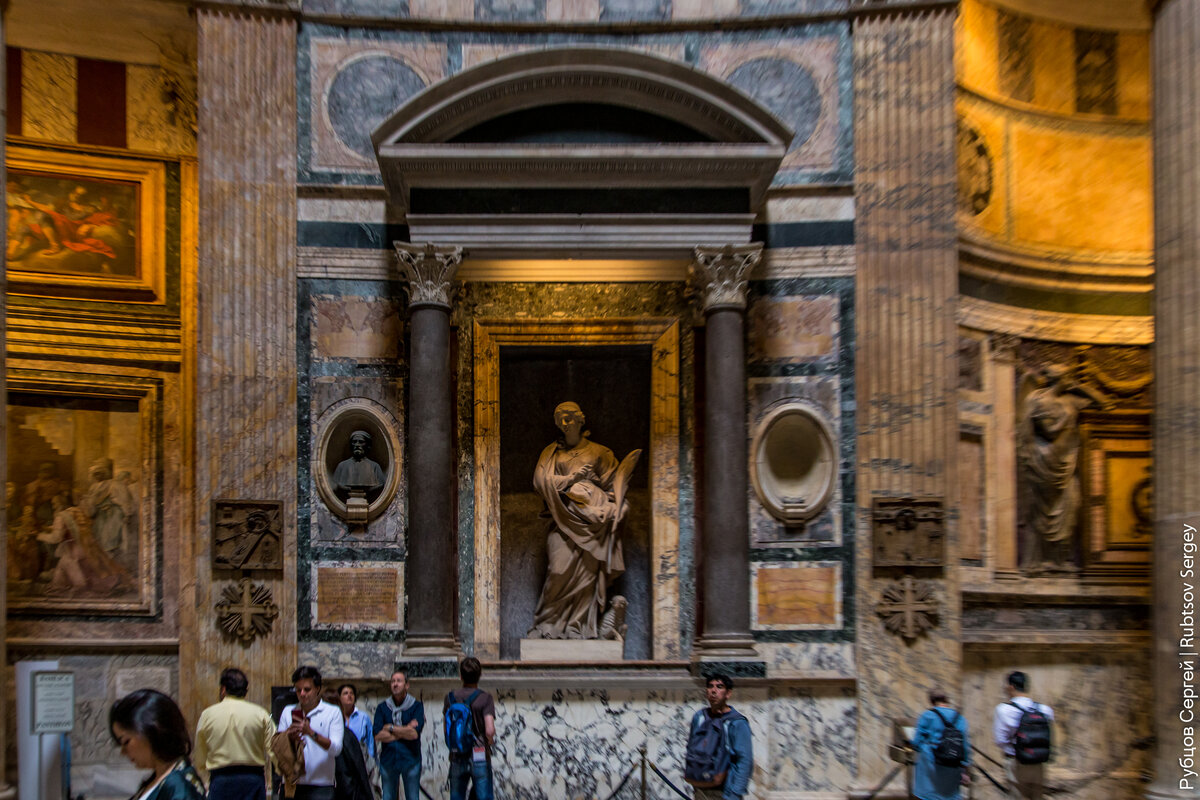 Внутри Пантеона погребены многие известные люди Италии, в частности упомянутый выше король Виктор Эммануил II и знаменитый итальянский живописец Рафаэль Санти.