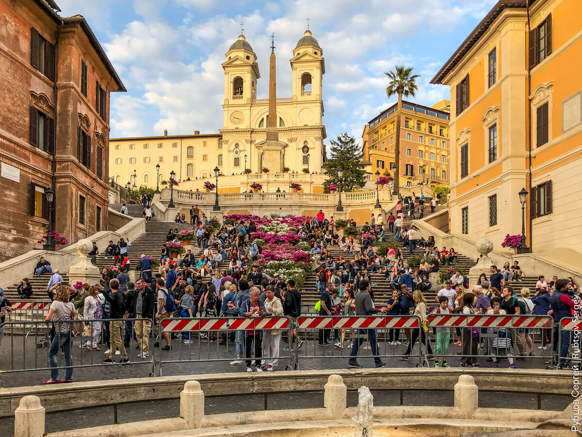Такая же ситуация и на знаменитой Испанской лестницы к церкви Тринита-деи-Монти, которая издалека выглядит будто нарисованной. Желающих посидеть на ее знаменитых ступенях довольно много: