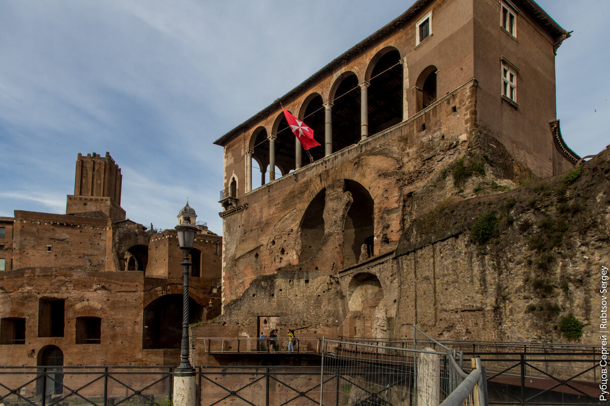 Здание дома рыцарей Родоса — официальное местопребывание рыцарей Мальтийского ордена, чей благ можно заметить на фасаде. Здание стоит на античных руинах форума императора Августа: