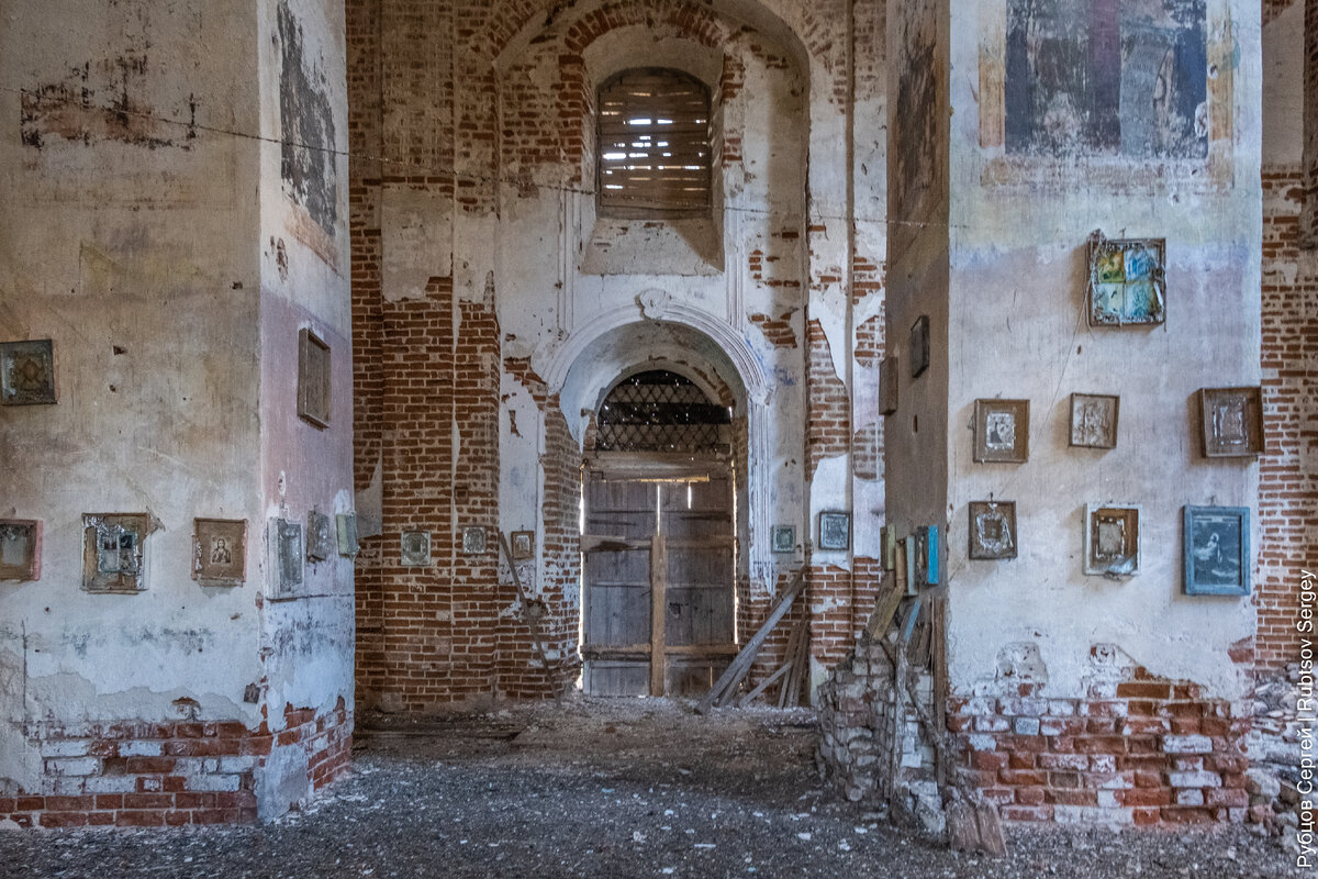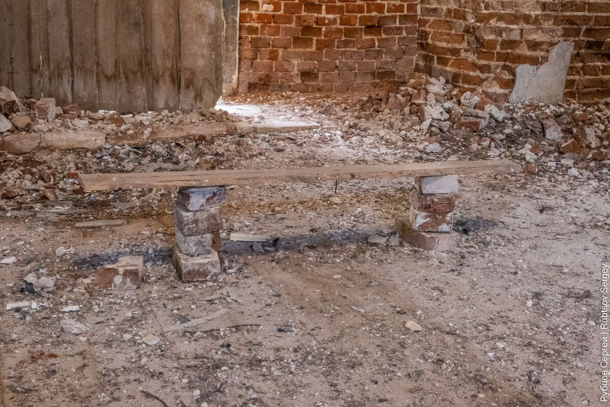 Со стороны трапезной, где раньше была колокольня, дверь оказалось открыта, при этом по ней видно, что после закрытия она переделывалась: