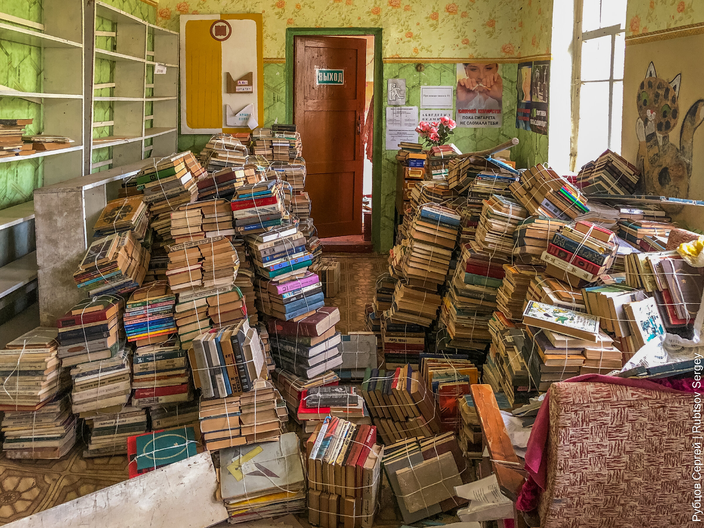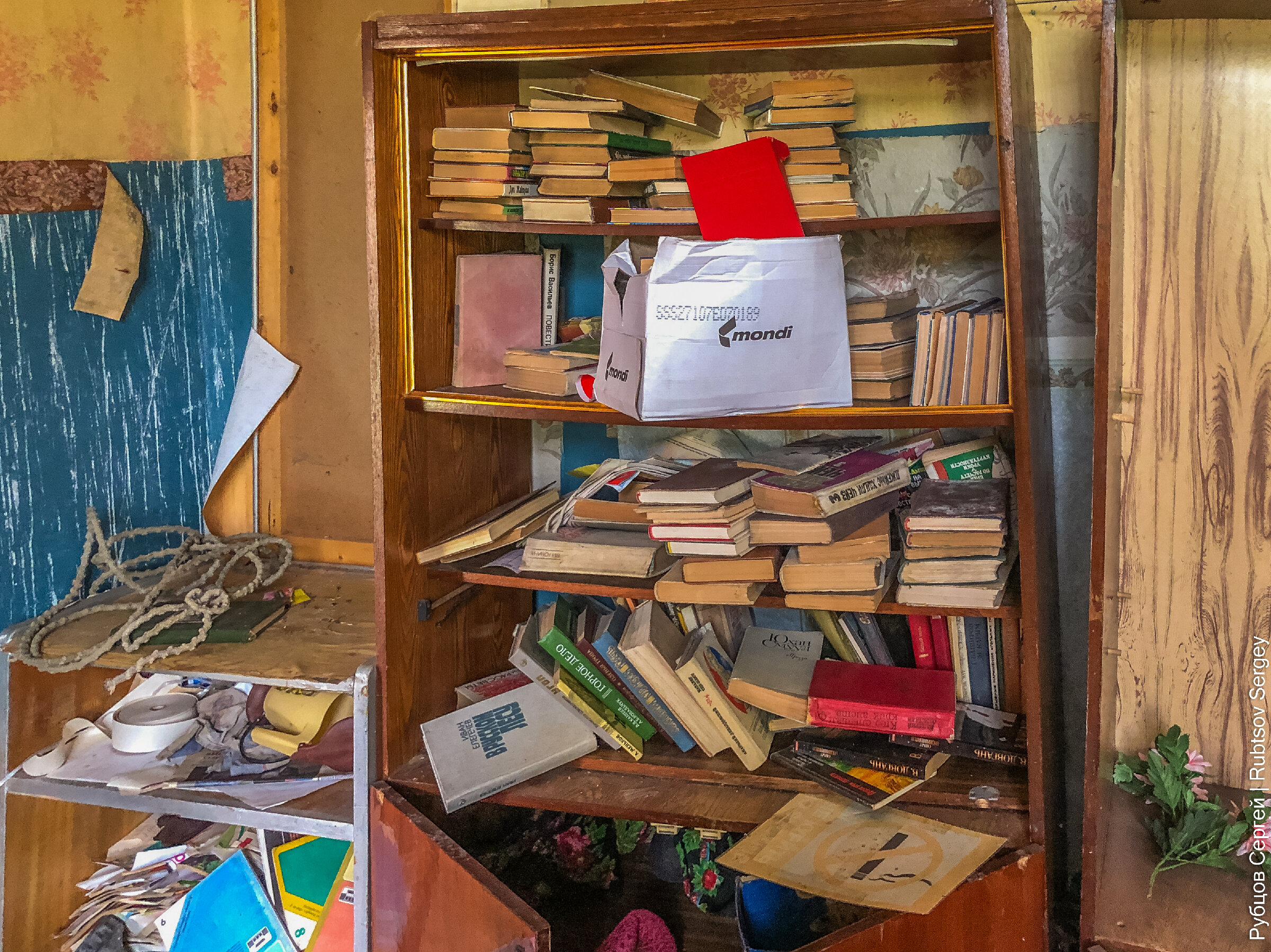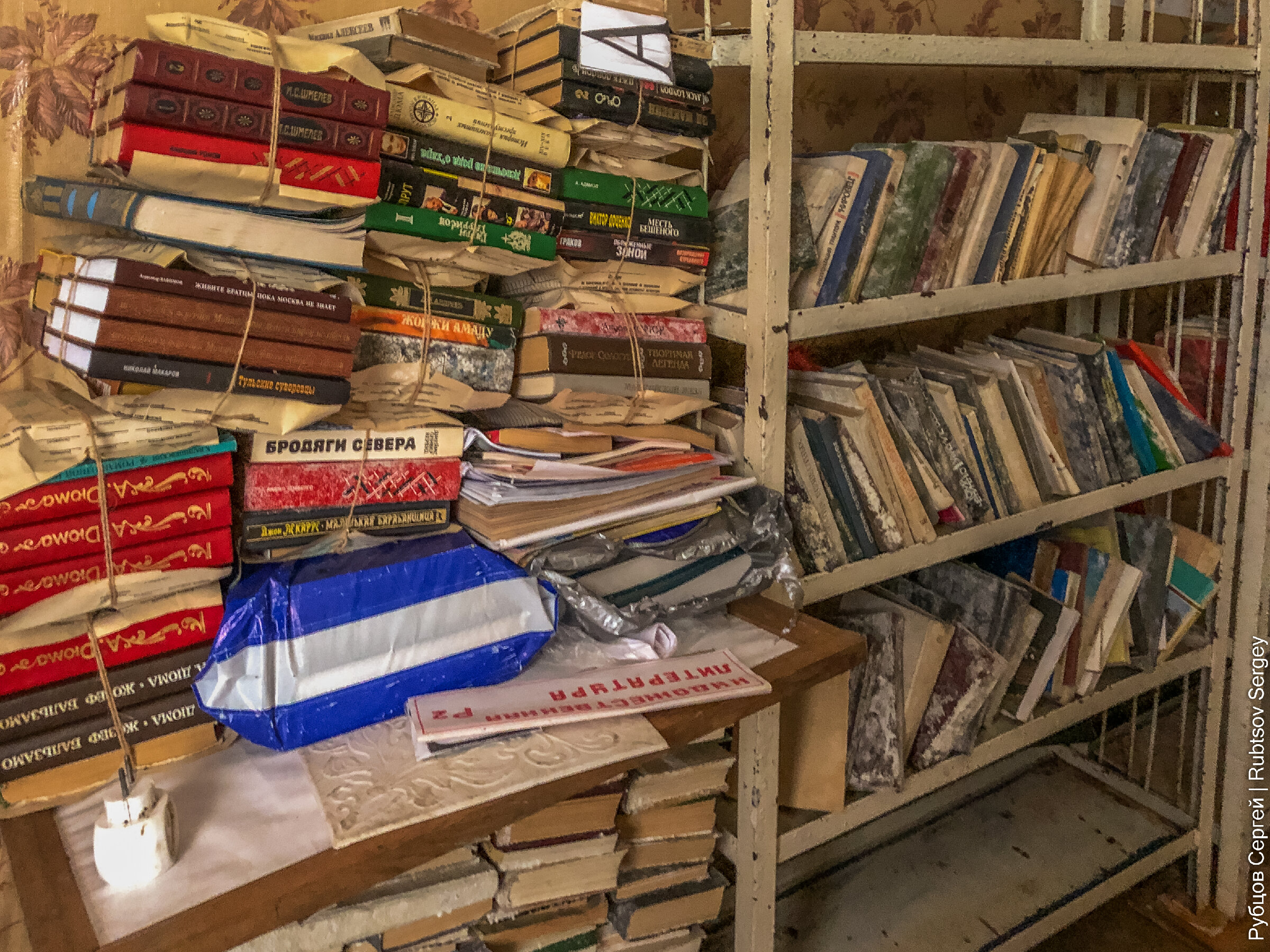 За одной из дверей, которая казалась самой закрытой и не приступной, но поддавшейся от небольшого усилия, оказалась местная библиотека, которую кто-то аккуратно упаковал для транспортировки, но так и не вывез.