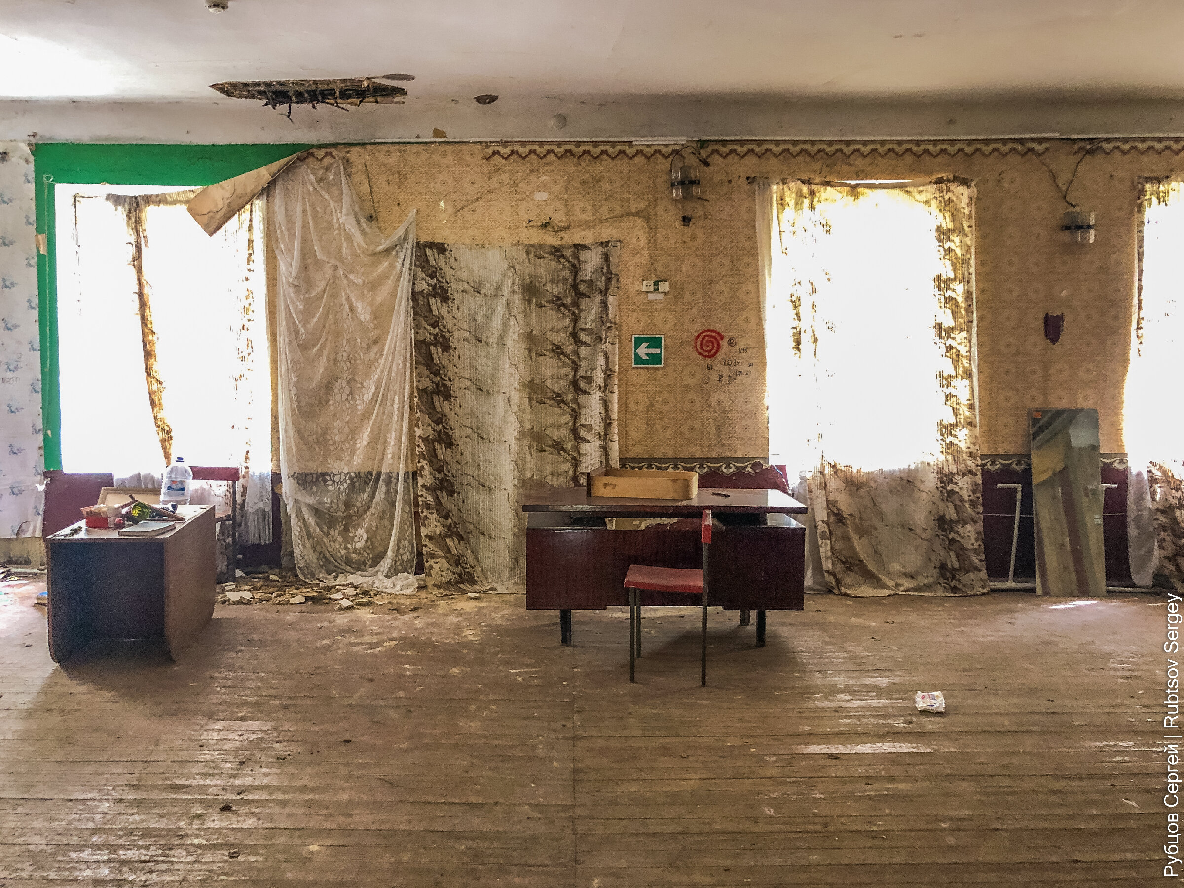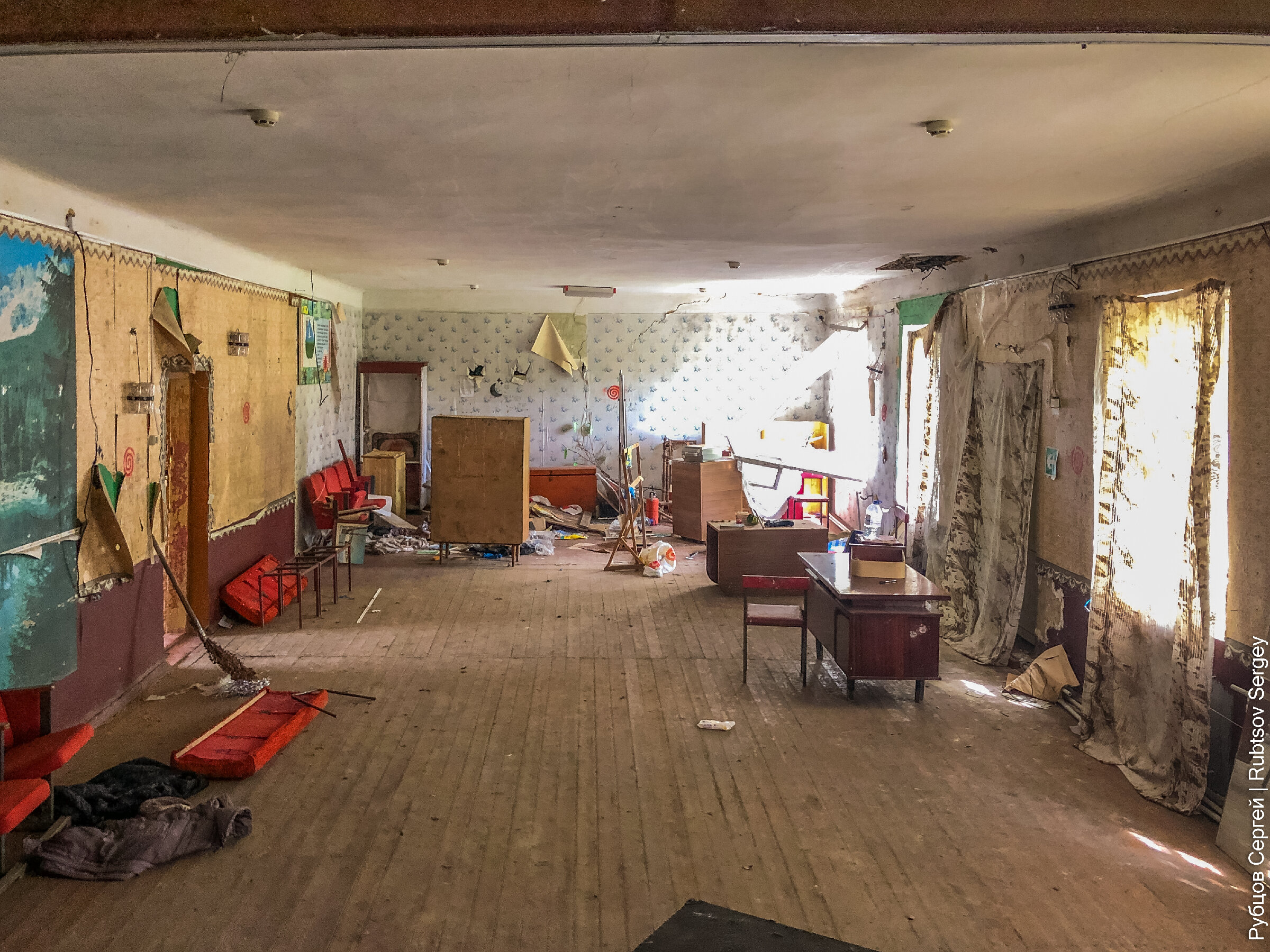 Попадаем в больше помещение, которое одновременно являлось актовым залом и каким-то кабинетом.