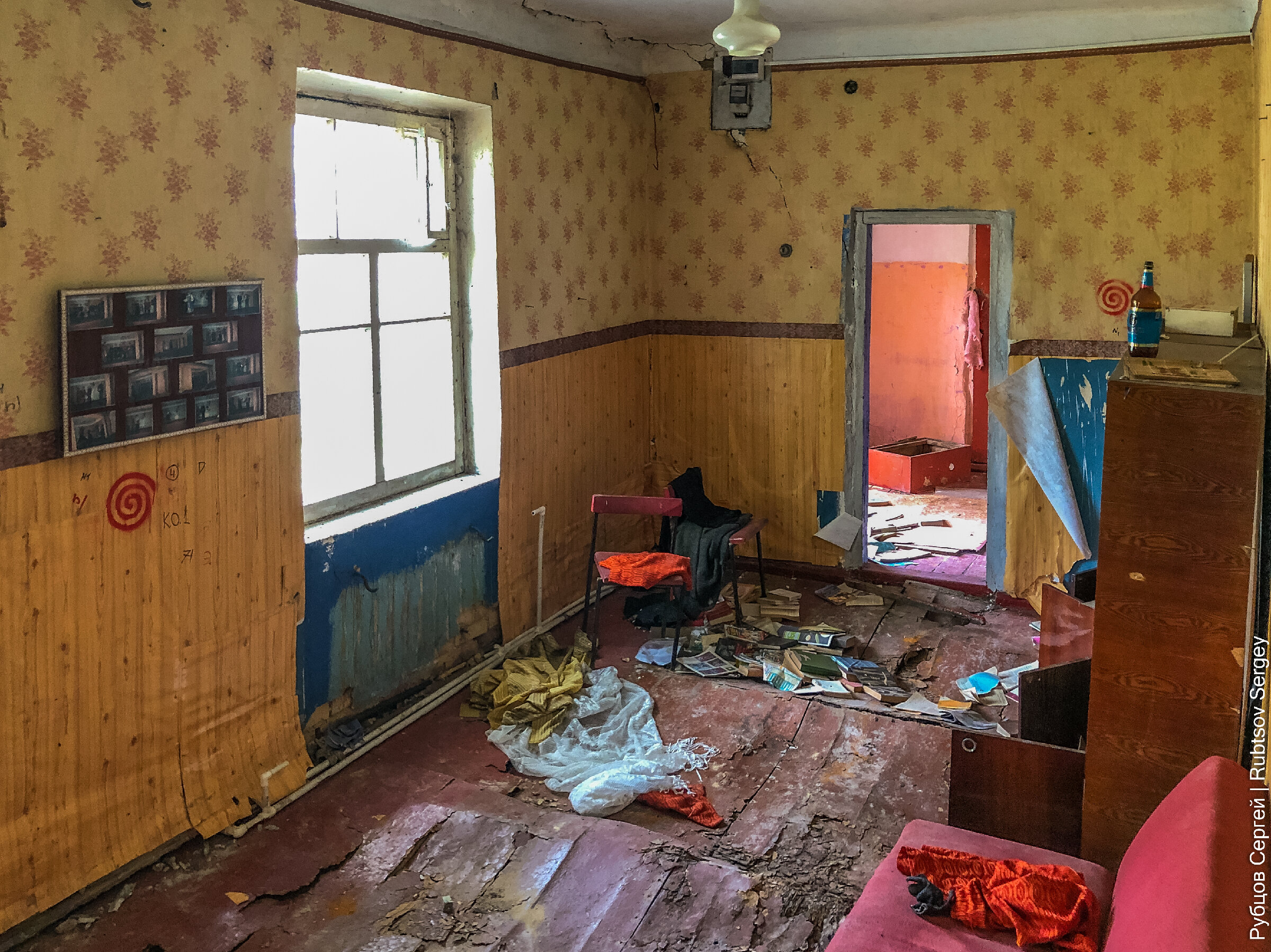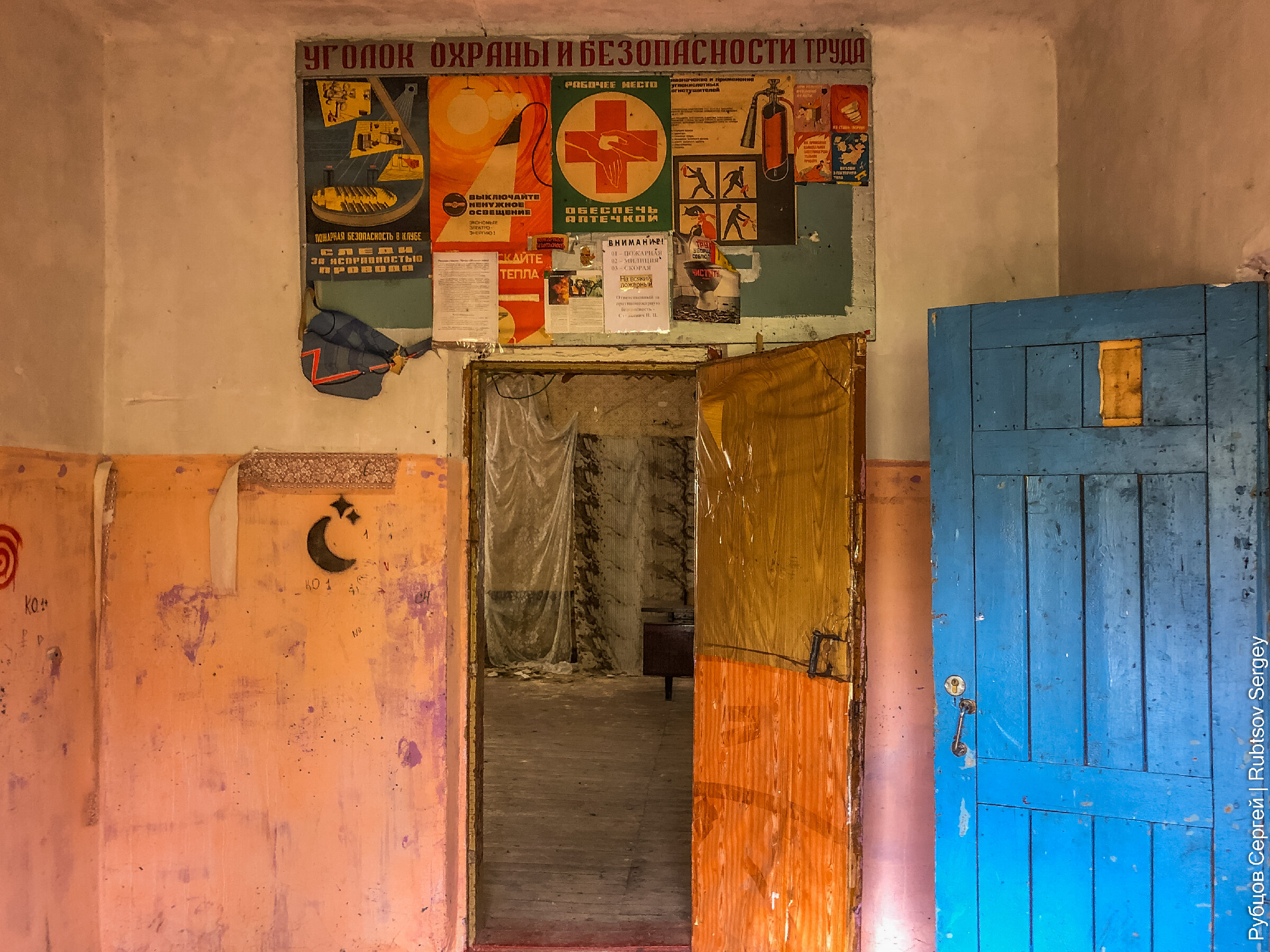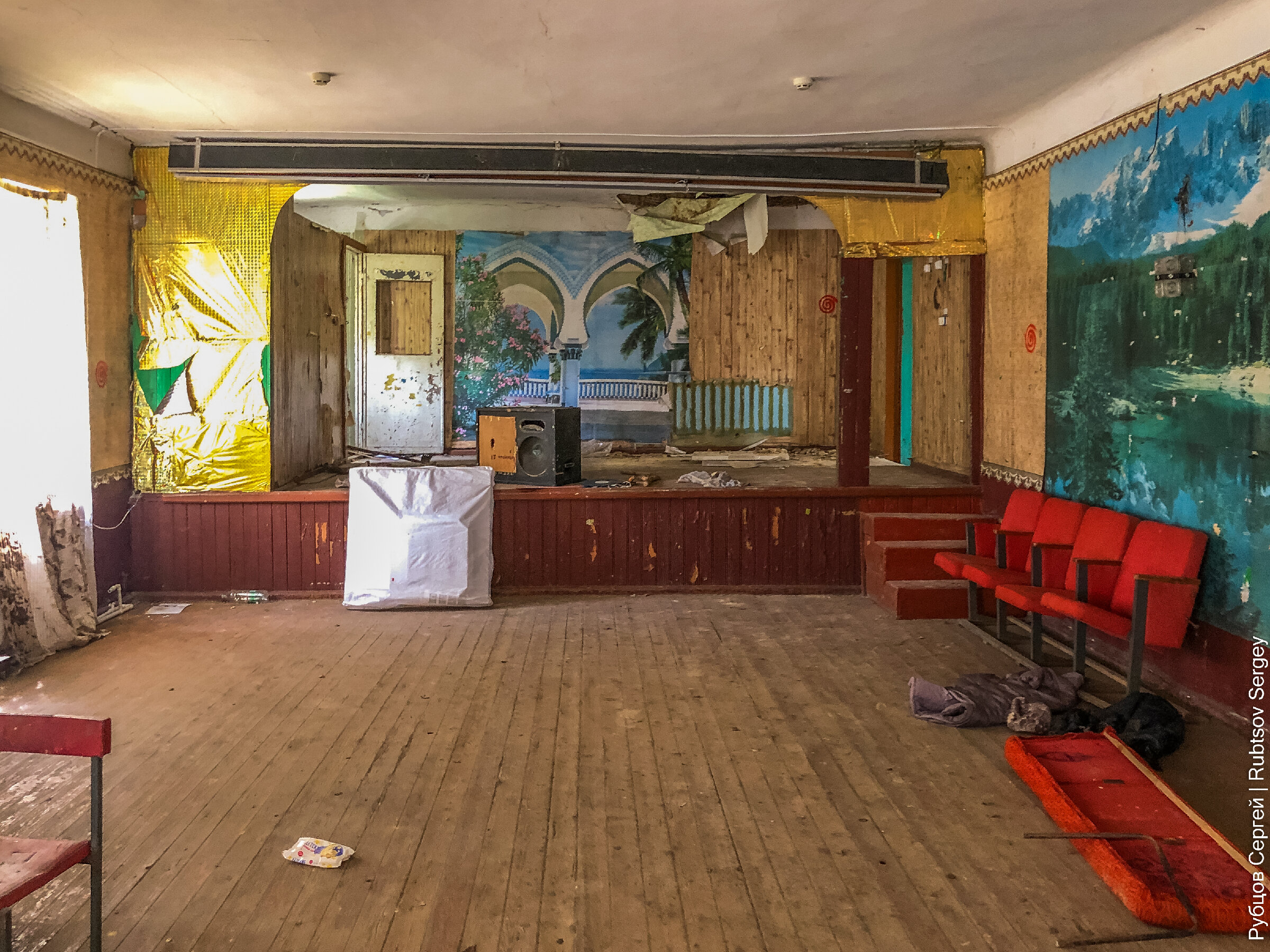 Ежедневно проезжая одной и той же дорогой по маршруту дом-работа-дом, я давно приметил, что стоящее возле дороги здание ДК в одном из сел покинула жизнь. Я с интересом стал наблюдать, что же будет с ним дальше. И вот недавно настал тот день, когда вместо уже привычной наглухо закрытой двери я увидел манящий проем открытого входа. В такой ситуации всегда надо пользоваться моментом, даже если под рукой только телефон, потому что второго шанса может и не быть (через несколько дней, когда я вернулся с камерой, дверь была забита гвоздями).