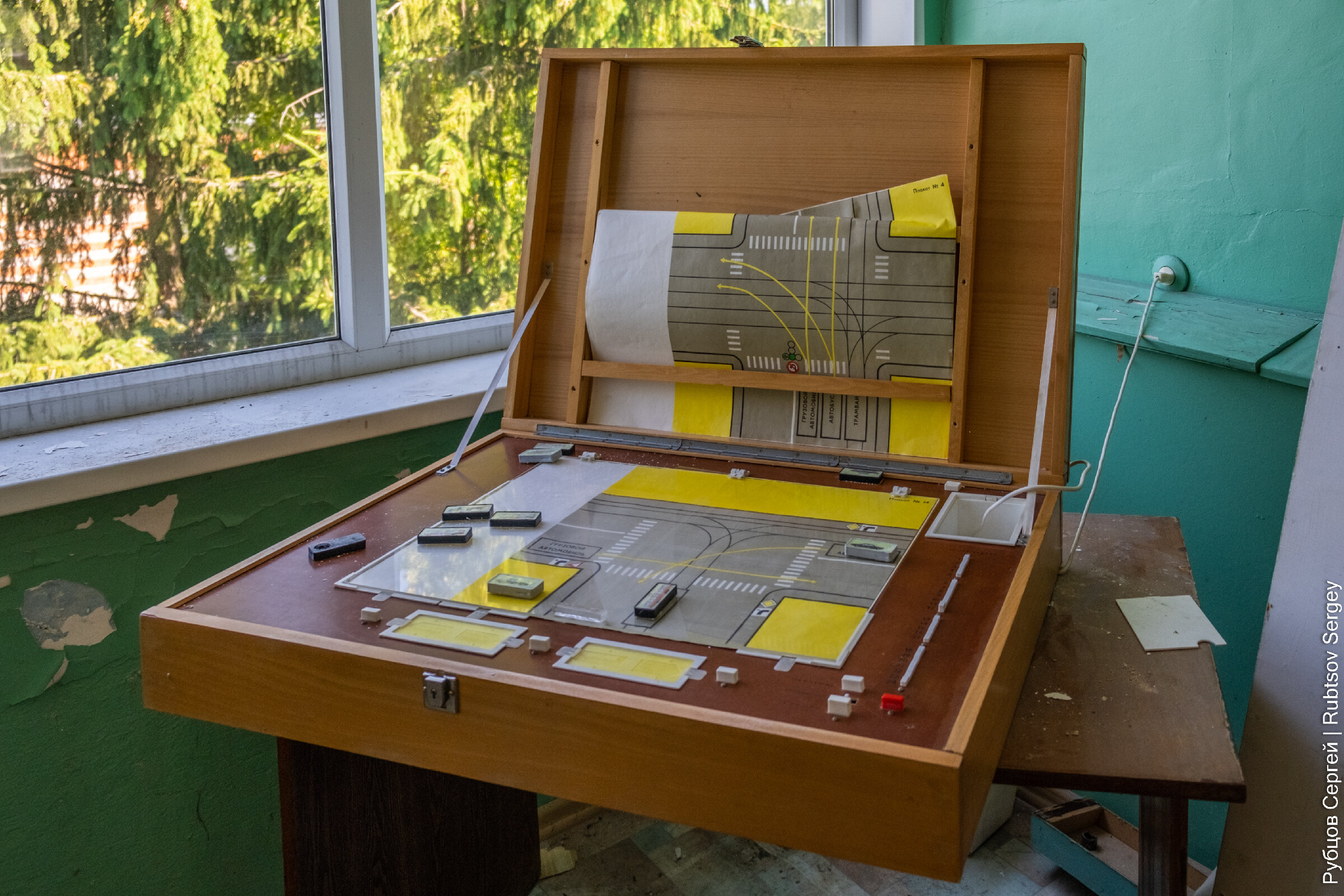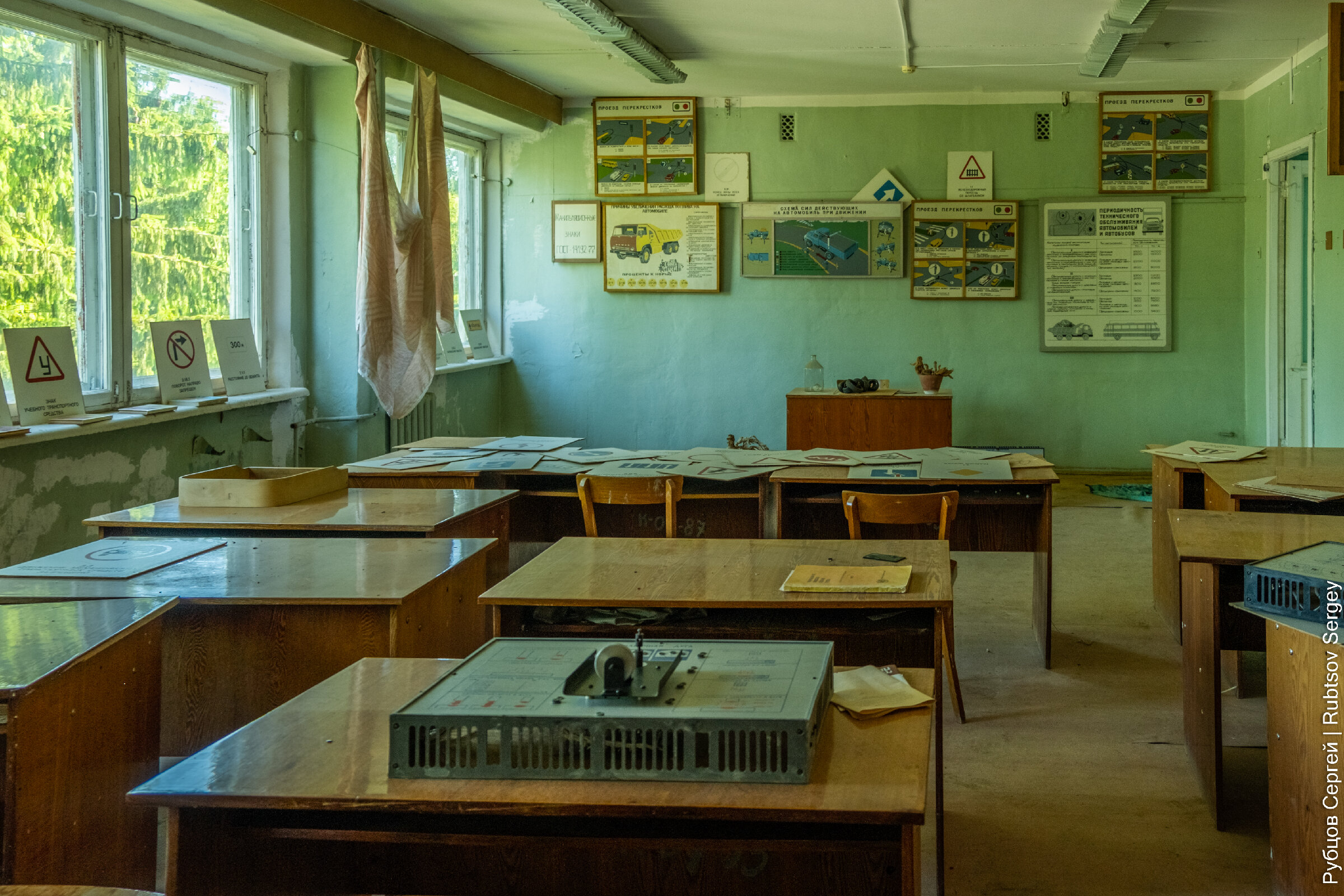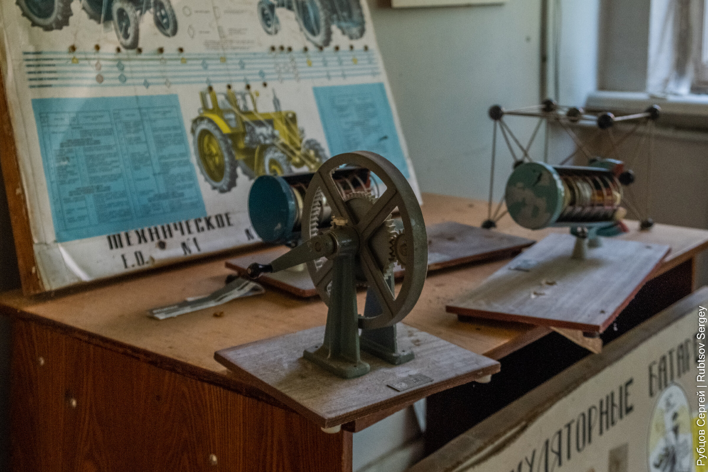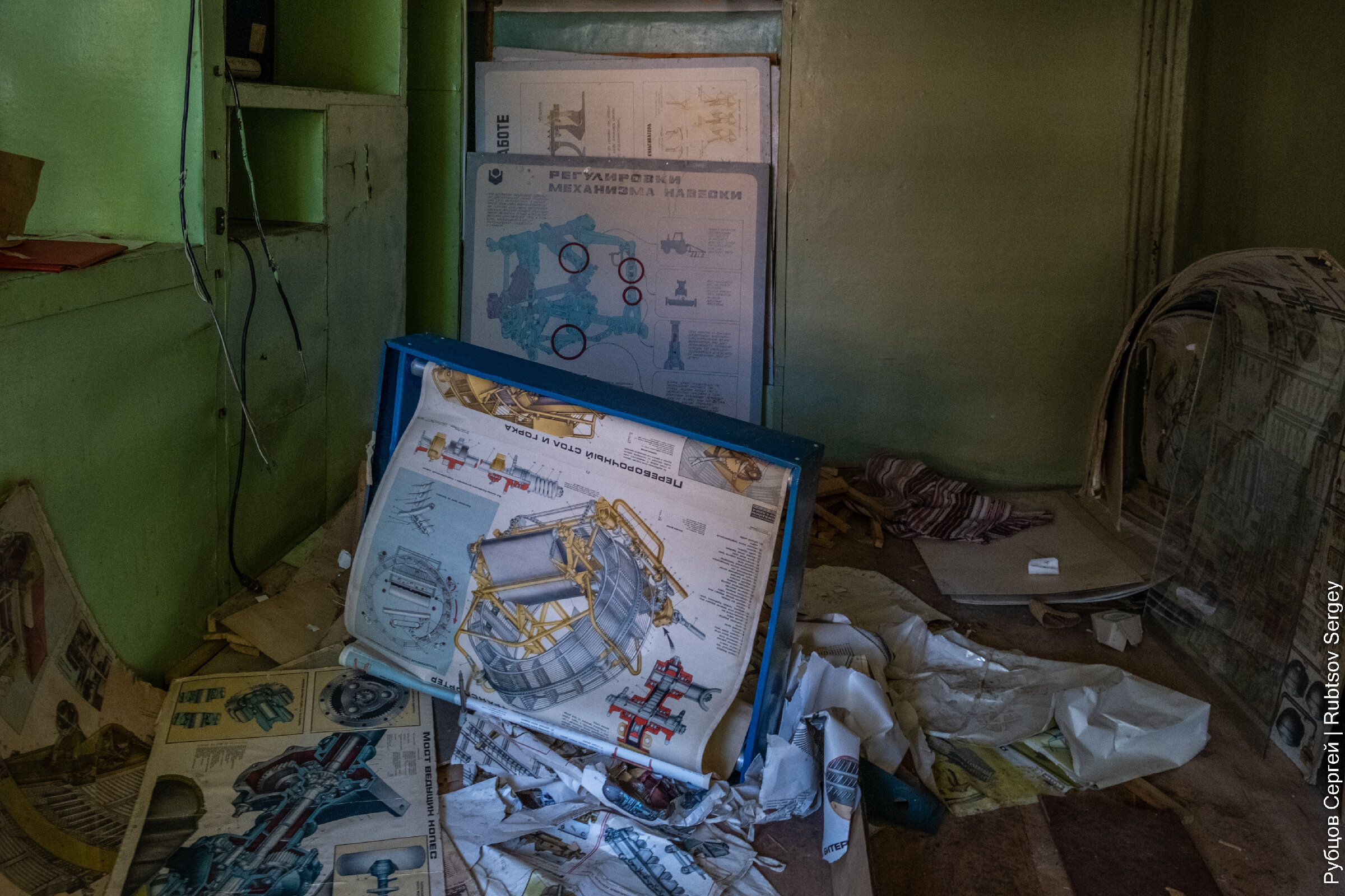 В здании еще сохранилось множество учебных пособий и никем не тронутых вещей, хотя видно, что постепенно все ломается и разворовывается.