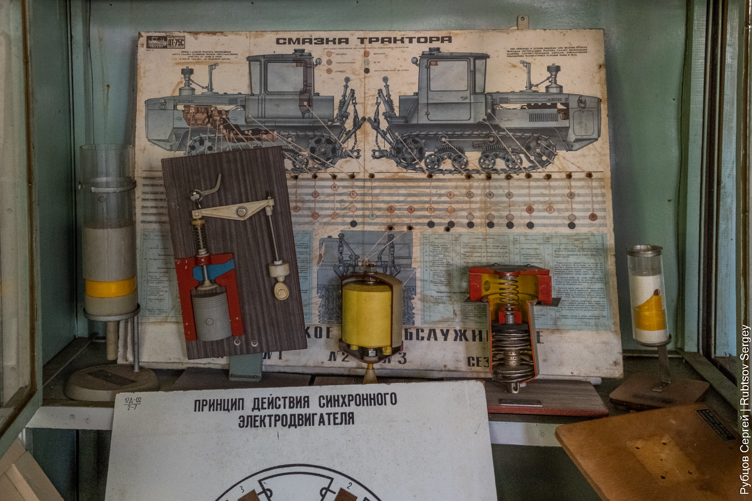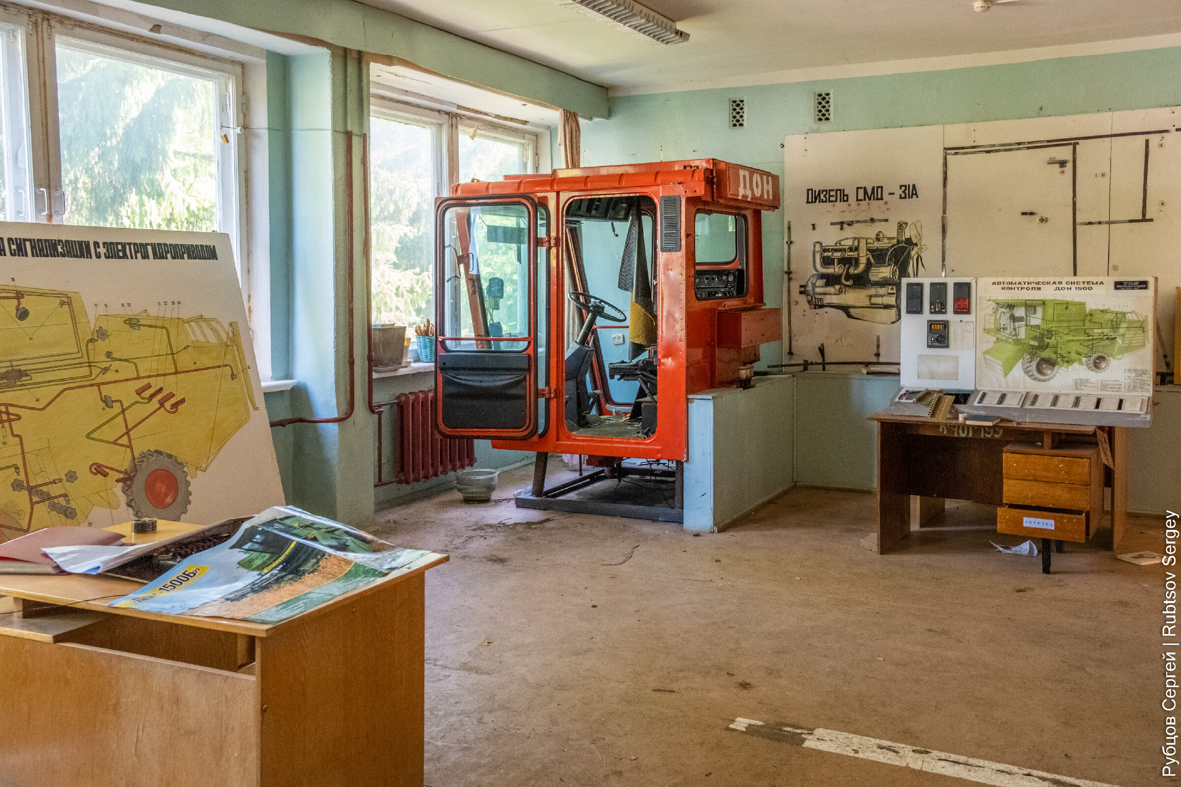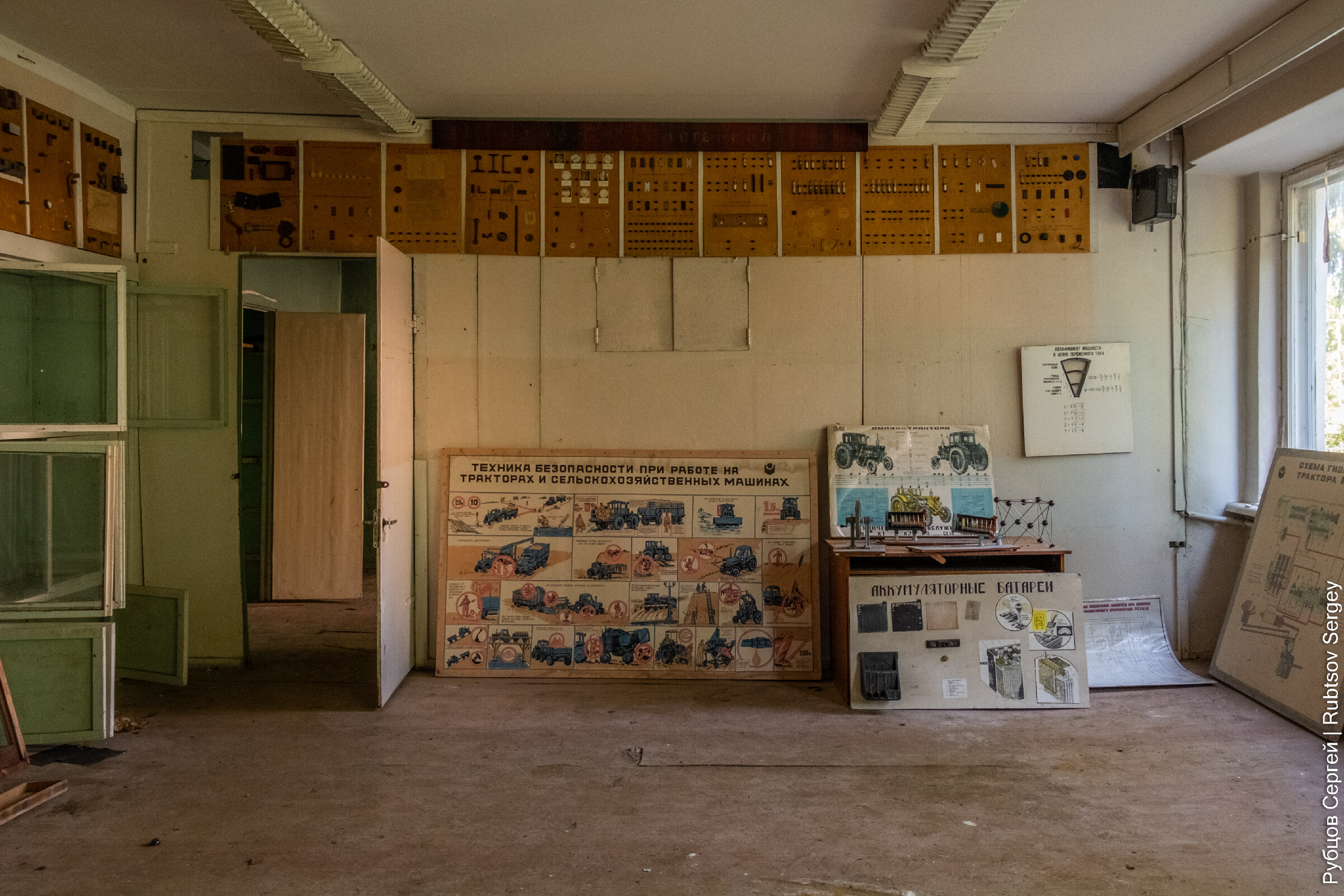 Тут же сохранилось множество обучающих стендов, на которые вынесены оригинальные кнопки управления сельхозтехникой.
