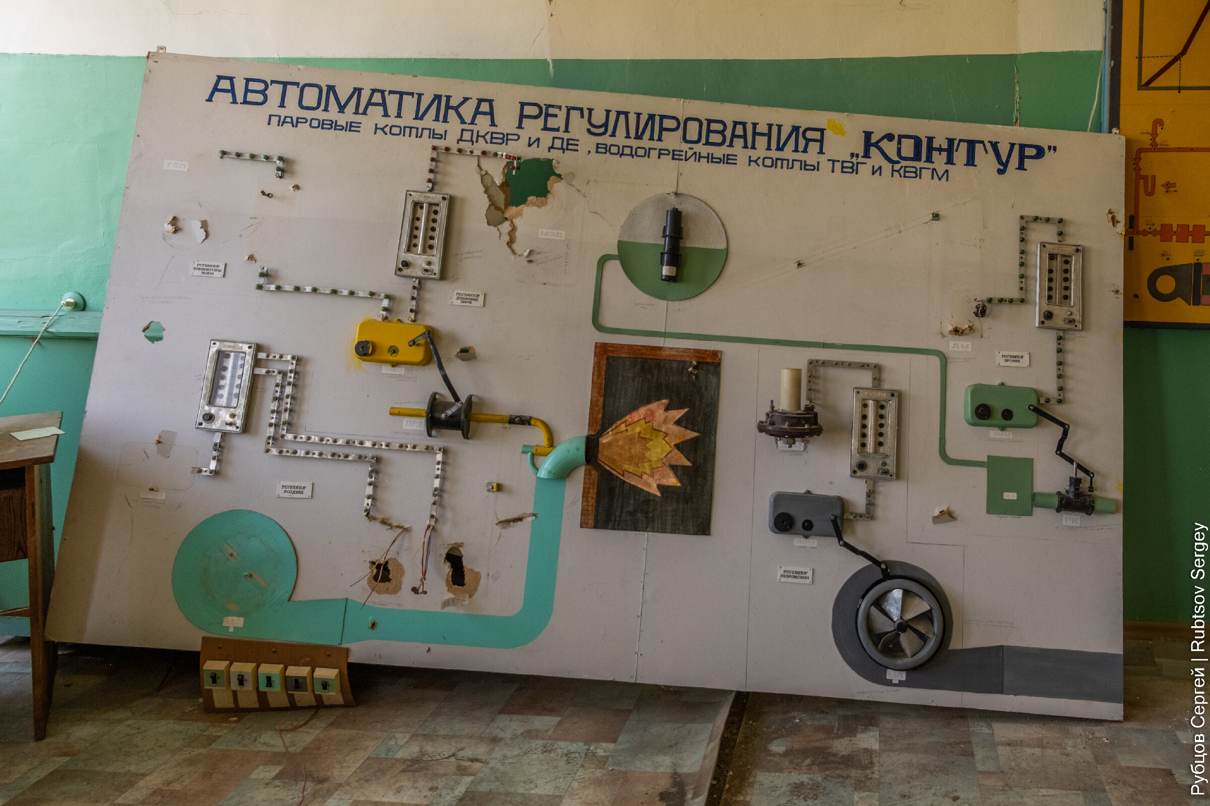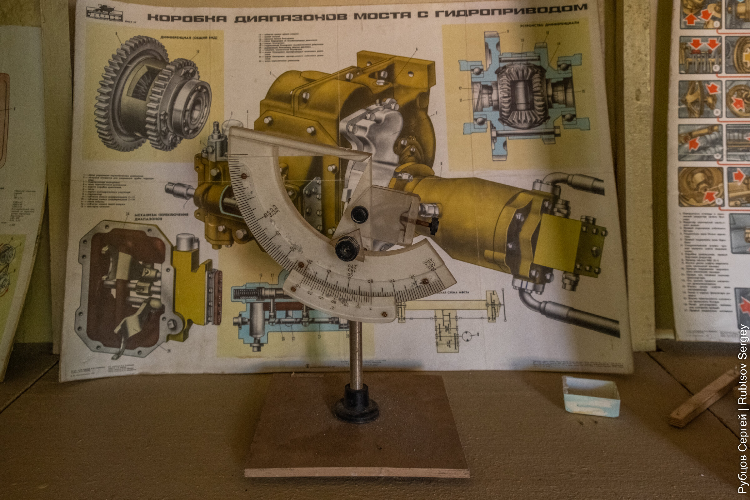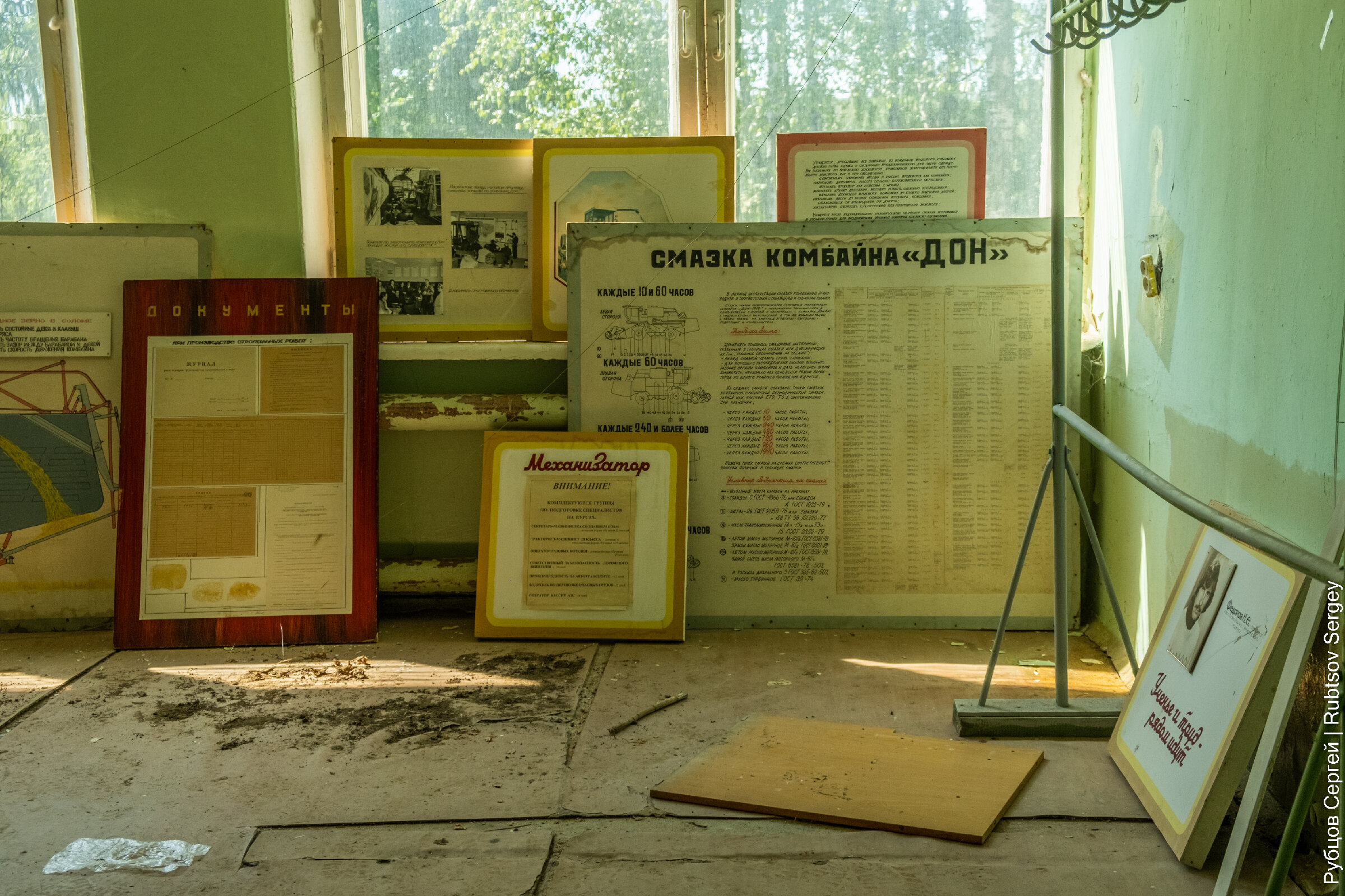 Тут же сохранилось множество обучающих стендов, на которые вынесены оригинальные кнопки управления сельхозтехникой.