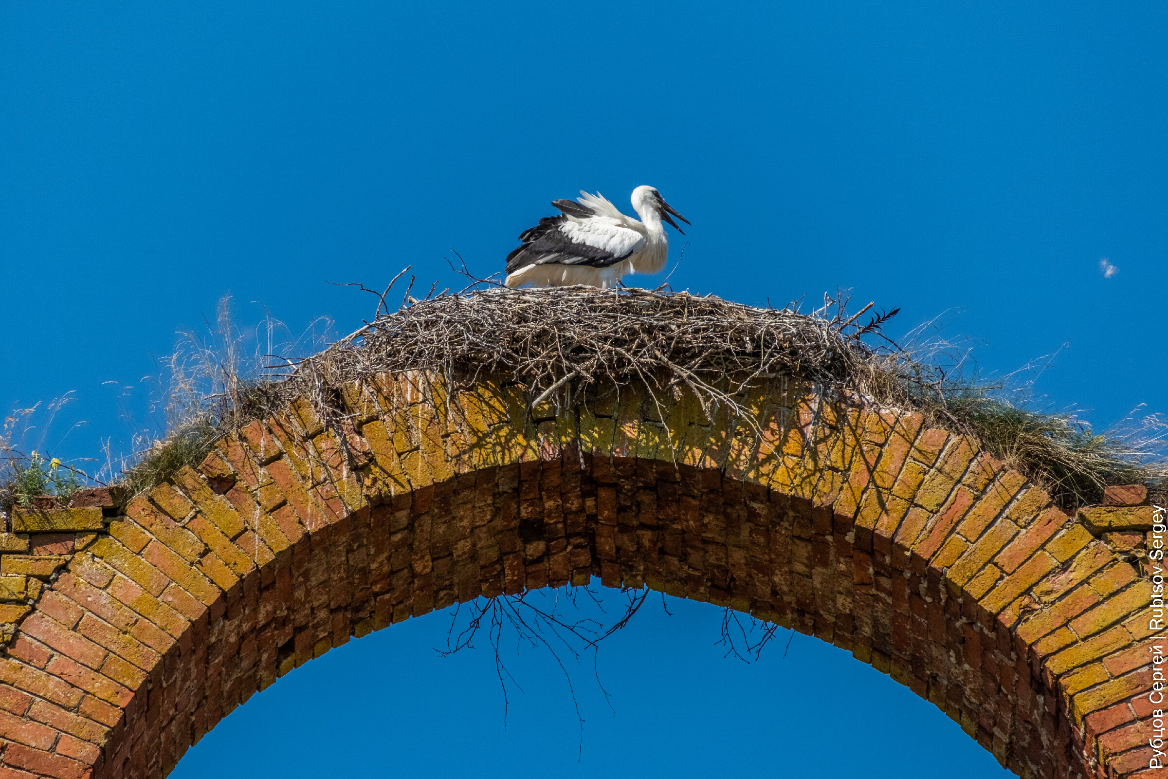 На вершине удобно устроил свое жилище аист.